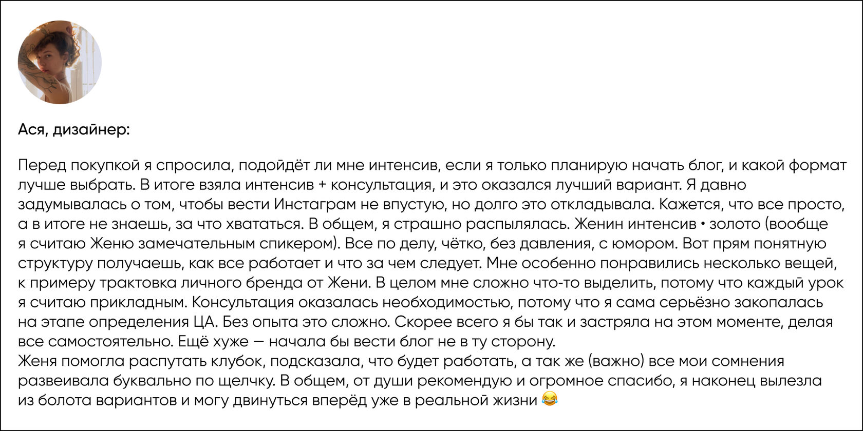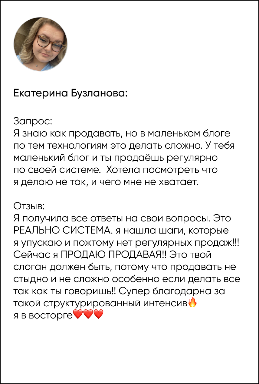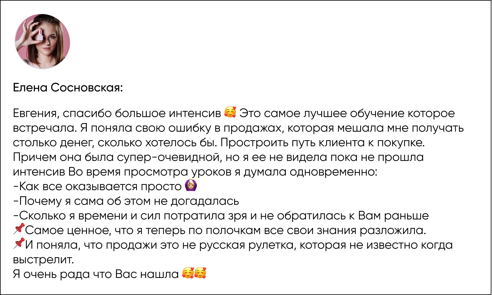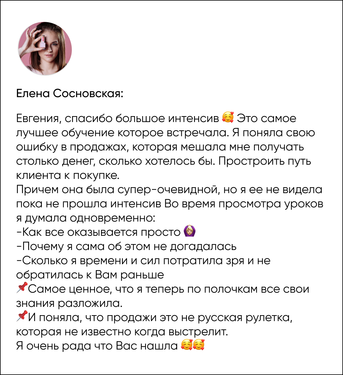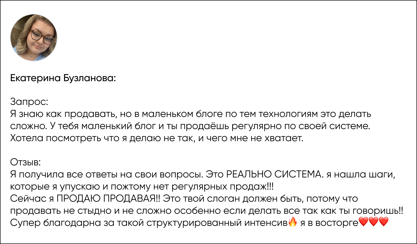 А еще у вас больше никогда НЕ будет проблемы «Пока веду активно блог — у меня покупают. Не веду, ни одной заявки». После внедрения того, что вы узнаете на интенсиве у вас будут покупать ВСЕГДА! Много и за любую стоимость!