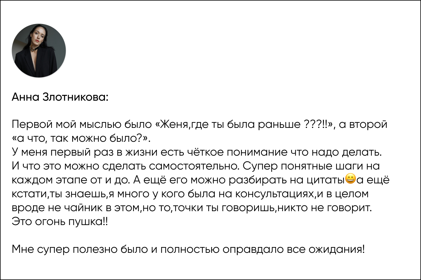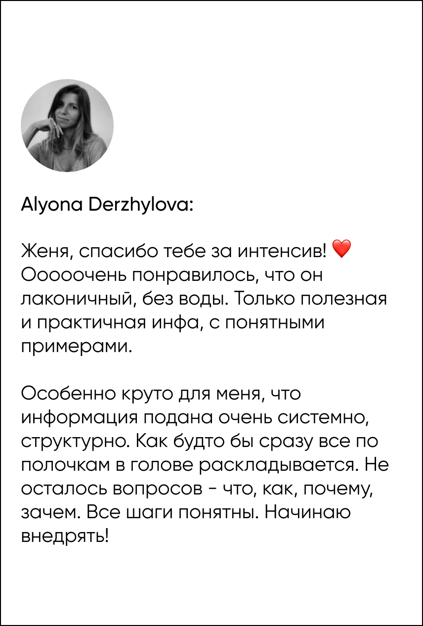 Разрабатываем пошаговый план по внедрению всего, что вы узнали на этом интенсиве. А также намечаем план, куда стоит двигаться, чтобы еще увеличить продажи, когда внедрите все из этого интенсива:)
